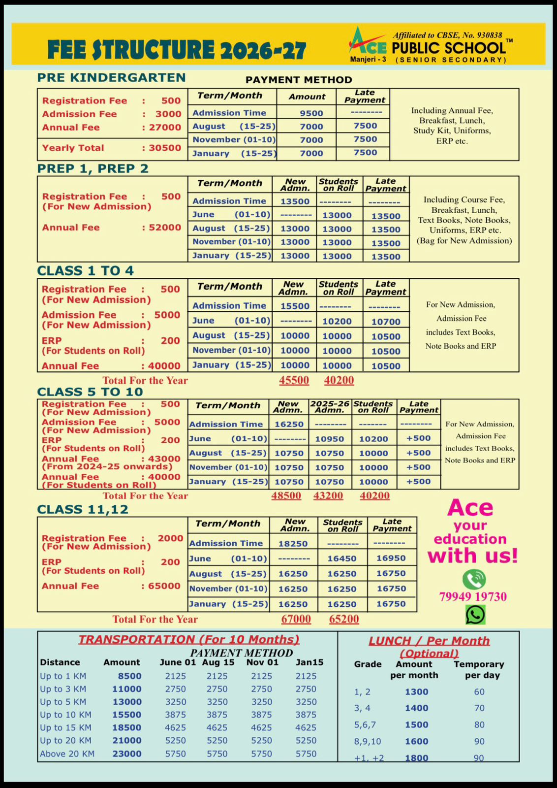 Fee for the whole year is paid together during admission .However; no amount is collected as donation or capitation fee. A fee chart is issued to every parent in March.